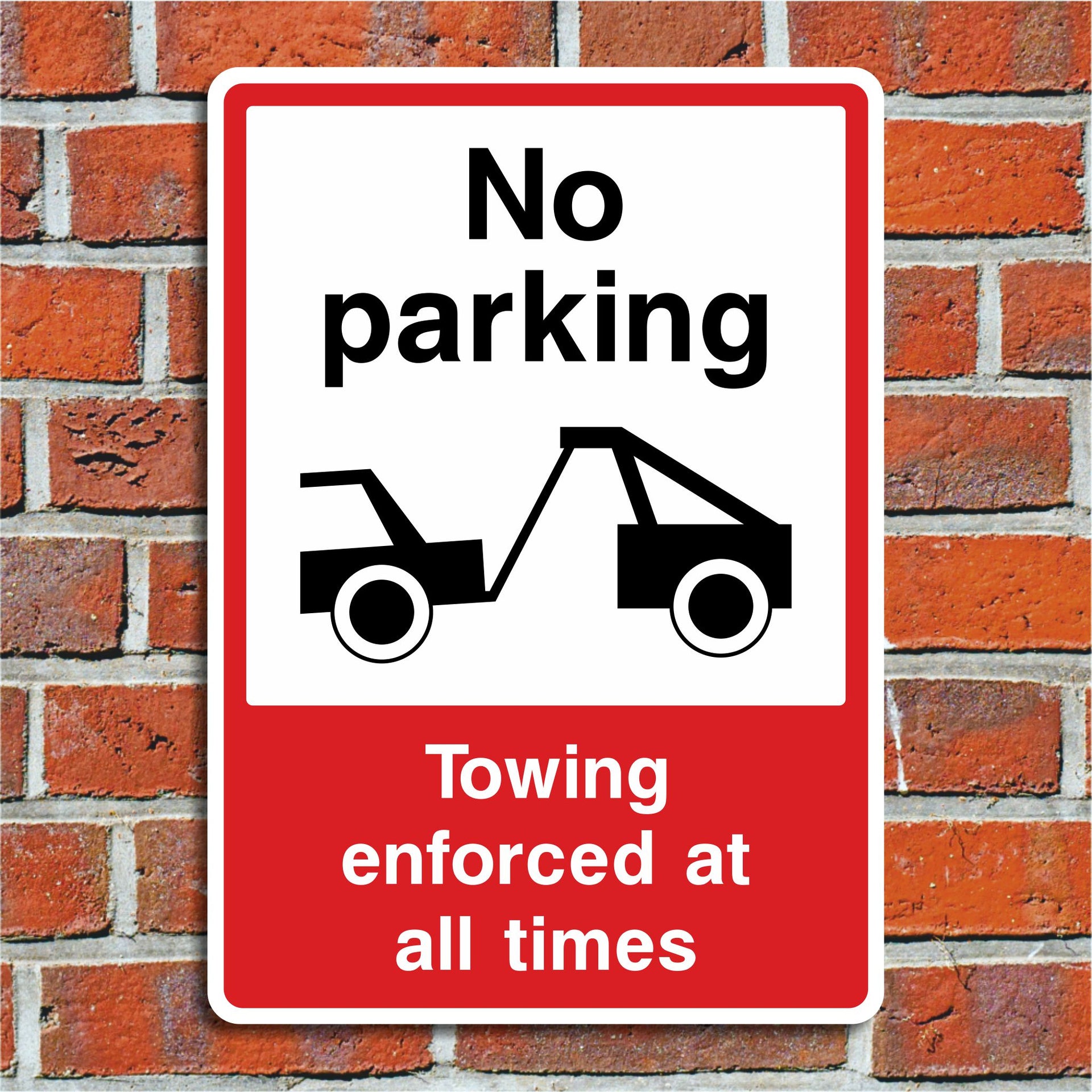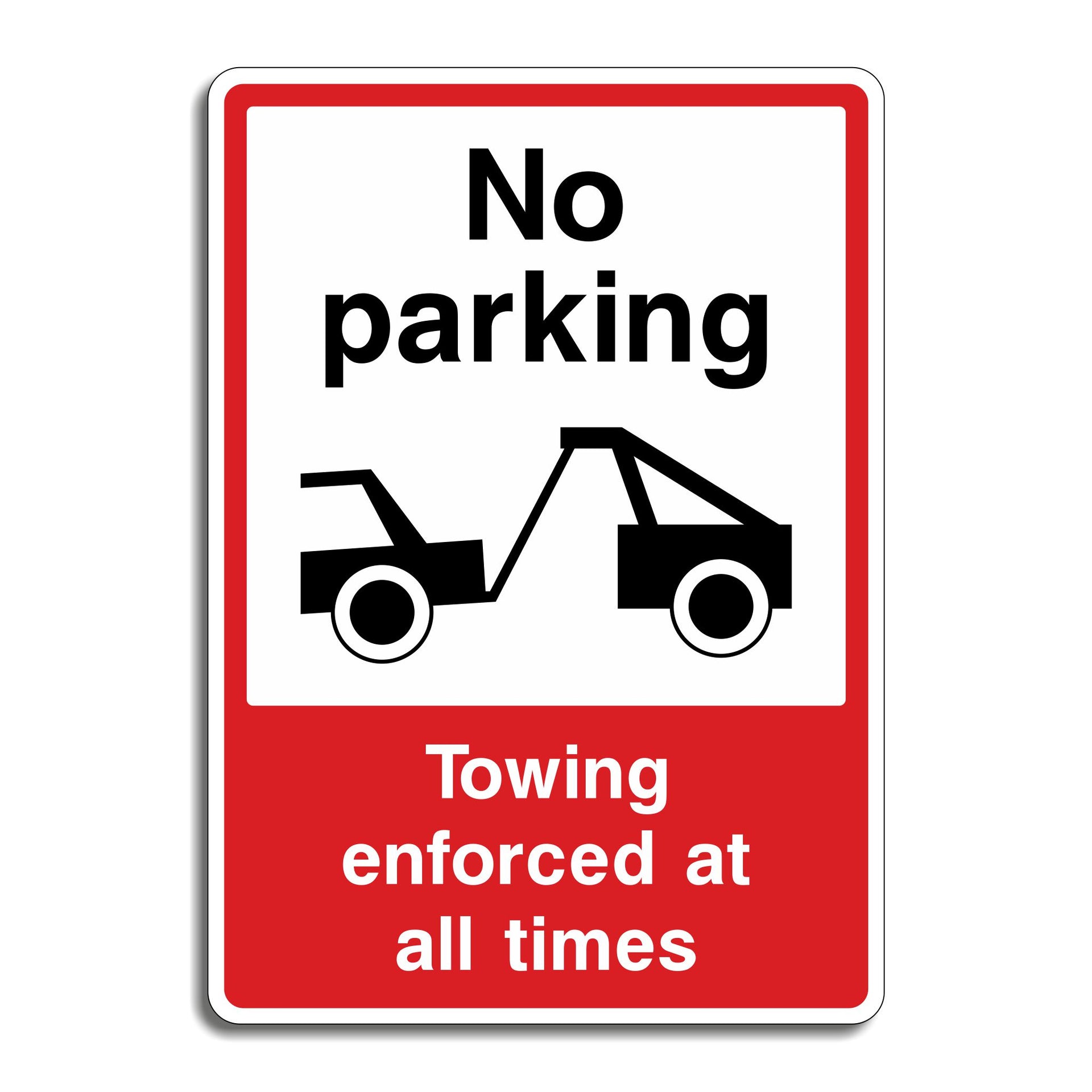 No Parking Towing Enforced at All Times Signs are used to clearly prohibit parking in a designated area at any time and warn that any violations will result in the vehicle being towed, without exceptions. They emphasize that the no-parking restriction is always in effect, day or night, weekdays or weekends. The warning of immediate towing serves as a strong deterrent, discouraging drivers from leaving vehicles in the restricted area. All our safety signs are compliant with BS EN ISO 7010 where applicable.