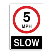 5 MPH Slow Signs are used to alert drivers to reduce their speed to a very low level in areas where careful driving is essential for safety. These signs are commonly used in environments like parking lots, construction zones, or private roads where pedestrians, children, or other vulnerable users may be present, and where tight spaces or obstacles require extra caution. By encouraging drivers to slow down to 5 mph, the signs help prevent accidents, improve reaction times, and ensure safe navigation through potentially hazardous or congested areas.