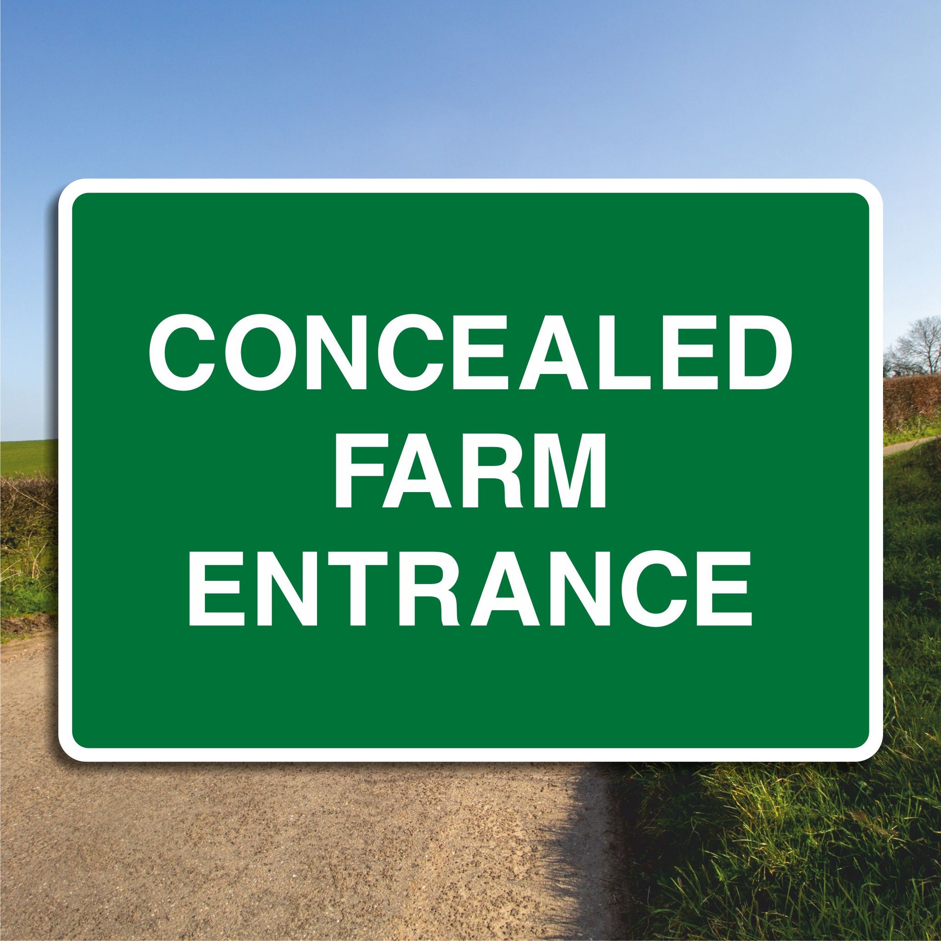 Concealed Farm Entrance Signs are traffic safety signs used primarily in rural or agricultural areas. Their main purpose is to warn drivers that there is a hidden or less-visible farm entrance ahead, typically used by slow-moving vehicles like tractors, harvesters, or trucks entering or exiting fields. Concealed farm entrances are often hidden by curves, hills, trees, or tall crops, making them hard to see from the road. All our safety signs are compliant with BS EN ISO 7010 where applicable.