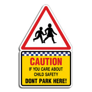 Caution If You Care About Child Safety Don't Park Here Signs are used to strongly discourage drivers from parking in areas where doing so could create safety hazards for children, such as blocking sight lines, crossing points, or access routes near schools or playgrounds. By appealing directly to the driver's sense of responsibility and concern for child safety, the sign uses emotional and cautionary language to encourage more thoughtful parking behavior.