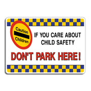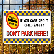 If You Care About Child Safety Don't Park Here Signs are used to deter drivers from parking in locations where their vehicles could compromise the safety of children, such as near school entrances or on narrow roads. The sign appeals to the driver's sense of morality and concern for child welfare, using a direct and emotionally resonant message to highlight the potential consequences of their actions. This sign is part of a colourful range of school traffic hazard signs that are designed for added impact for use near schools. All our safety signs are compliant with BS EN ISO 7010 where applicable.