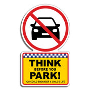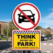 Think Before You Park You Could Endanger A Child's Life Signs are used to prompt drivers to consider the serious safety risks their parking decisions may pose, especially in areas near schools, playgrounds, or pedestrian crossings. By using direct and impactful language, the sign encourages drivers to reflect on the potential consequences of blocking sight lines, pavements, or access points where children are present.