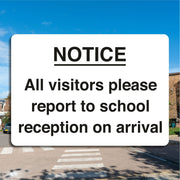 Notice All Visitors Please Report To School Reception On Arrival Sign