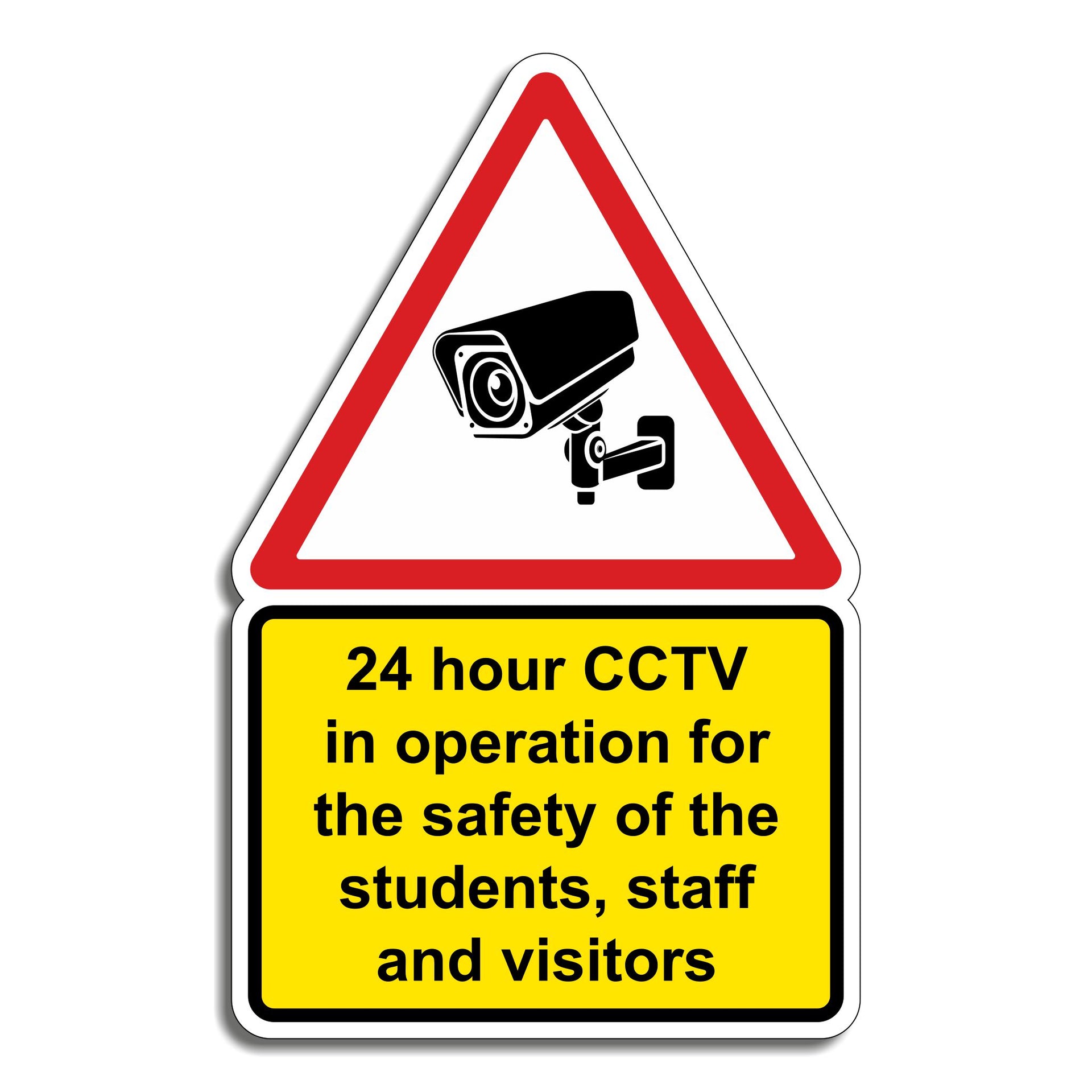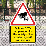24 Hour CCTV In Operation For The Safety Of The Students, Staff And Visitors Signs are used to inform everyone on the premises that continuous video surveillance is in place to enhance safety and security. These signs serve as a proactive measure to deter inappropriate or criminal behavior such as trespassing, bullying, vandalism, or theft.