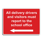All Delivery Drivers And Visitors Must Report To The School Office Sign with Left Pointing Directional Arrow