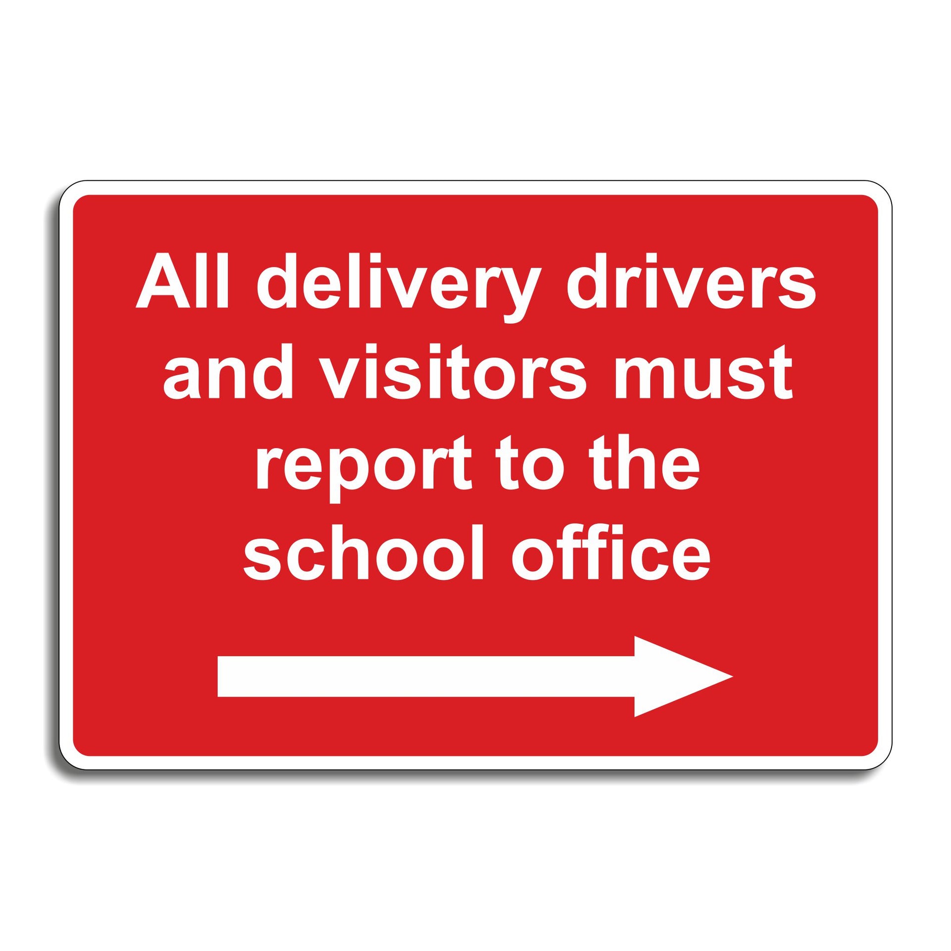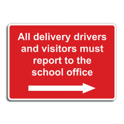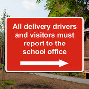 All Delivery Drivers And Visitors Must Report To The School Office Sign with Right Pointing Directional Arrow