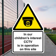 In Our Children's Interest CCTV Is In Operation On This Site Signs are used to inform all individuals that surveillance cameras are actively monitoring the area to help ensure the safety and well being of the children present. These signs highlight that the primary reason for CCTV use is to protect children by deterring inappropriate behavior, unauthorized access, and other potential security risks.