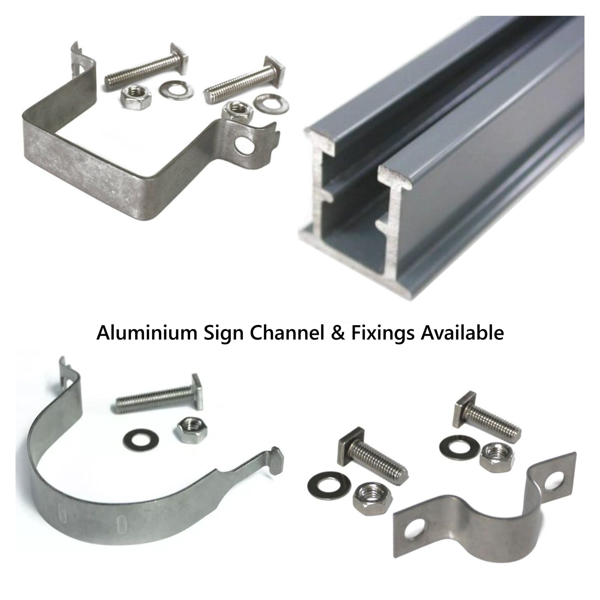 Sign Channel can be fitted on the back of your new aluminium composite signs which will allow the finished sign to be mounted on your existing metal posts, fences, gates or railings. If you select this option aluminium sign channels will be fitted to the sign during the manufacturing process and will be supplied complete with suitable sign fixing clips including nuts, bolts & washers.