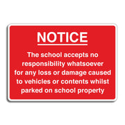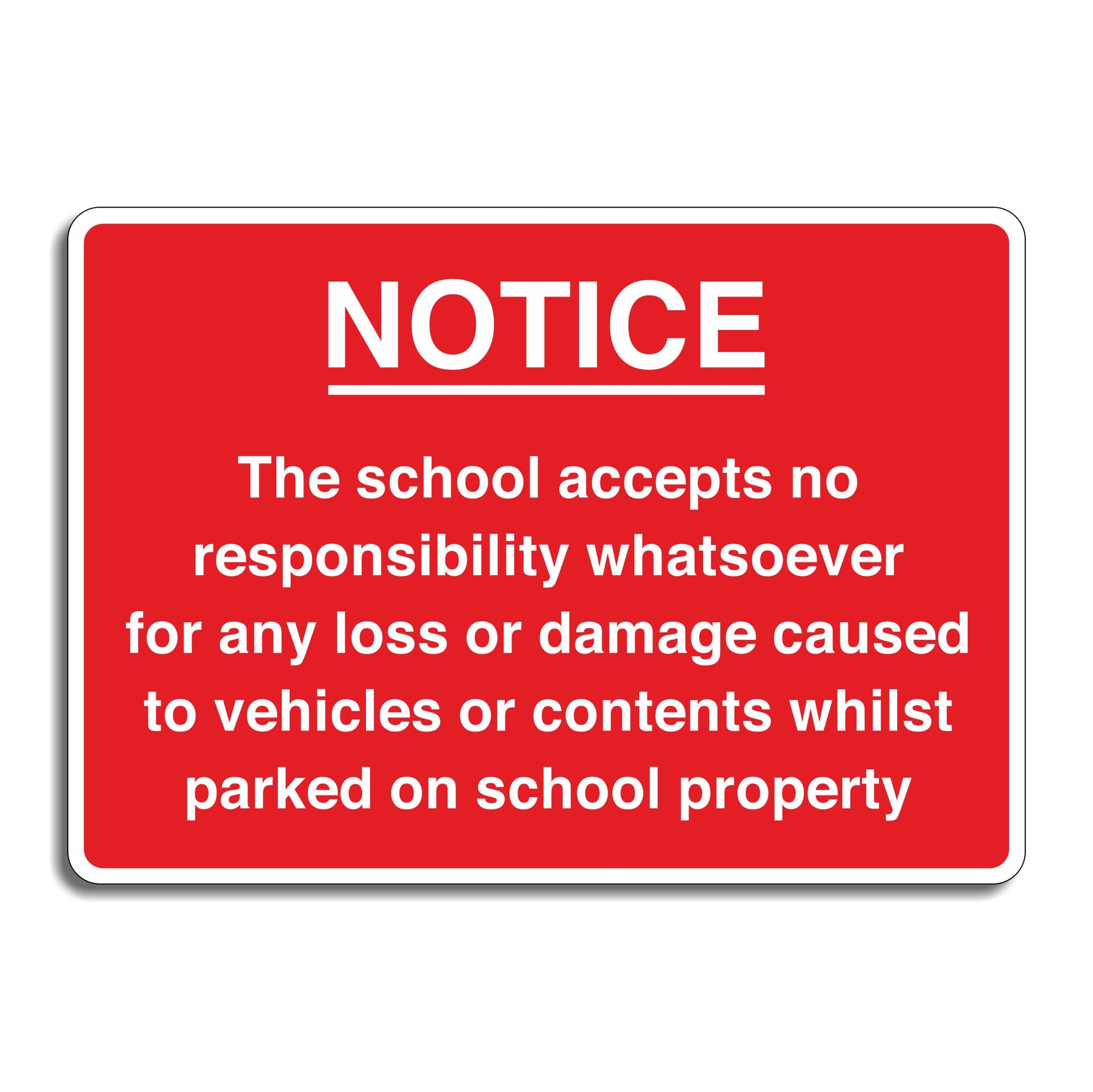 Notice The School Accepts No Responsibility Whatsoever for Any Loss or Damage Caused to Vehicles Signs are intended to inform drivers that the school does not take liability for any theft, damage, or loss that may occur to vehicles parked on or near its premises. These signs serve as a clear disclaimer, encouraging vehicle owners to take personal responsibility for securing their property and to be aware that parking is at their own risk. All our safety signs are compliant with BS EN ISO 7010 where applicable.