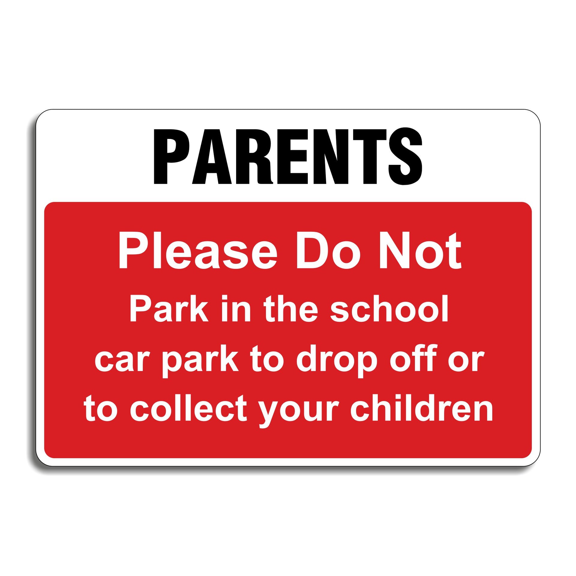 Parents Please Do Not Park in the School Car Park to Drop Off or to Collect Your Children Signs are used to manage traffic and ensure safety by restricting parent vehicles from entering staff-designated parking areas during busy times. These signs help reduce congestion, minimize the risk of accidents involving children and pedestrians, and ensure that school staff have reliable access to their allocated parking. All our safety signs are compliant with BS EN ISO 7010 where applicable.