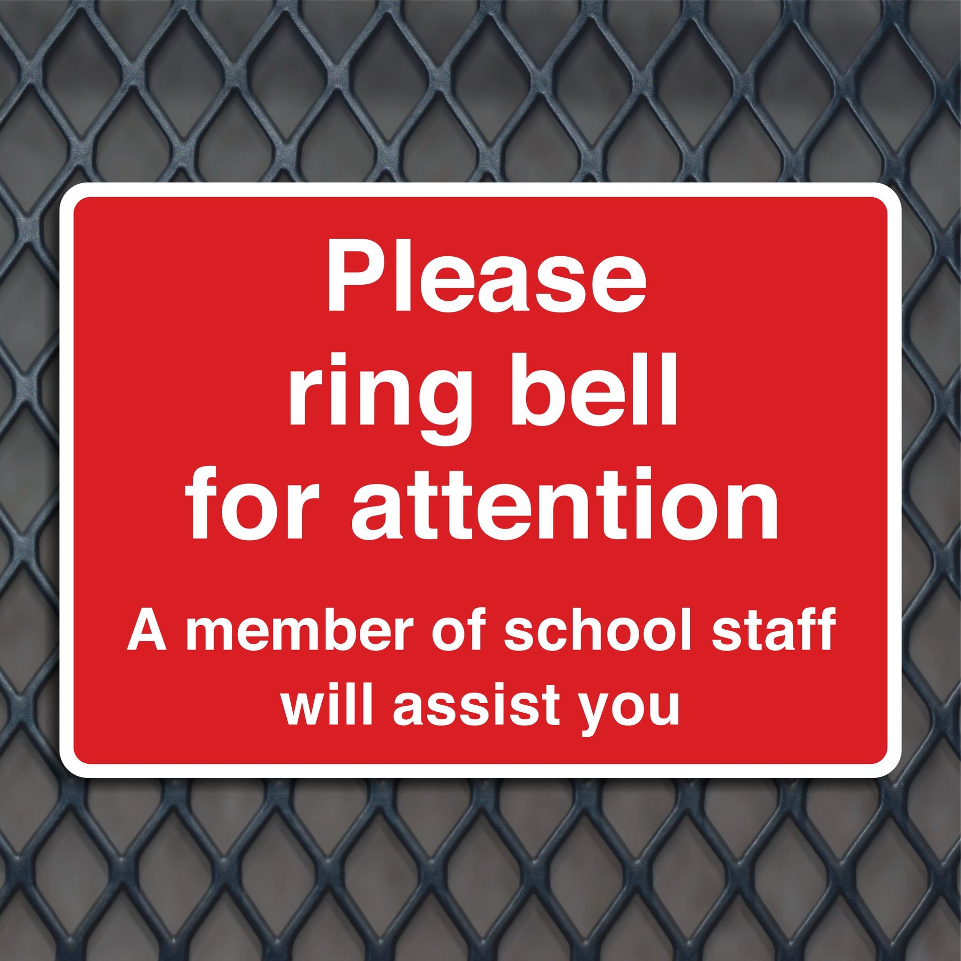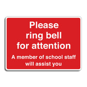 Please Ring Bell for Attention A Member of School Staff Will Assist You Signs are used to inform visitors that staff assistance is available and to provide a clear method for requesting help, especially when reception or entry points are not continuously staffed. These signs help manage visitor interactions efficiently by ensuring that those arriving know how to get the attention of school personnel. All our safety signs are compliant with BS EN ISO 7010 where applicable.