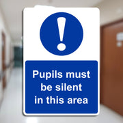 Pupils Must Be Silent in This Area Signs are displayed to clearly instruct students to remain completely silent in specific areas of a school where absolute quiet is necessary. The purpose of these signs is to support concentration, safety, or respect in environments such as examination halls, medical rooms, or areas near administrative offices. All our safety signs are compliant with BS EN ISO 7010 where applicable.