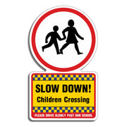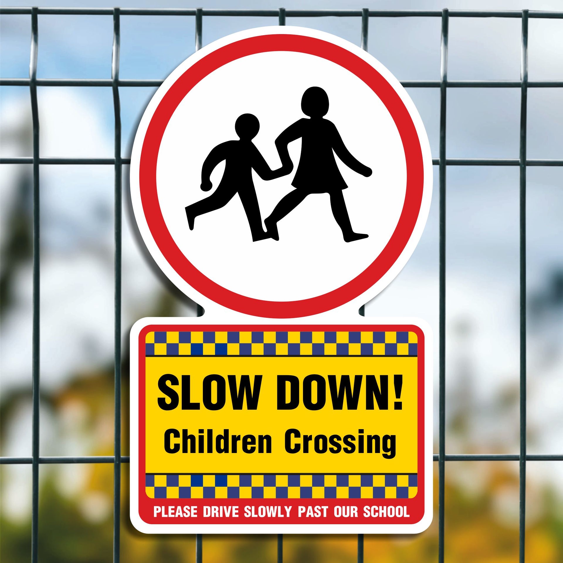 Slow Down Children Crossing Please Drive Slowly Past Our School Signs are used to alert drivers to the presence of children in or near the roadway, particularly during school hours, and to encourage reduced speeds for safety. These signs are strategically placed near schools, crossings, and drop-off zones to remind motorists to be extra cautious, watch for children who may suddenly enter the street, and help prevent accidents.