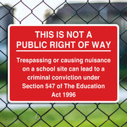 This Is Not a Public Right of Way Trespassing or Causing Nuisance on a School Site Can Lead to a Criminal Conviction Signs are intended to clearly inform the public that the school grounds are private property and not open for general passage. These signs warn that unauthorized entry or disruptive behavior is illegal and may result in prosecution, helping to deter trespassing, vandalism, and other nuisances. All our safety signs are compliant with BS EN ISO 7010 where applicable.