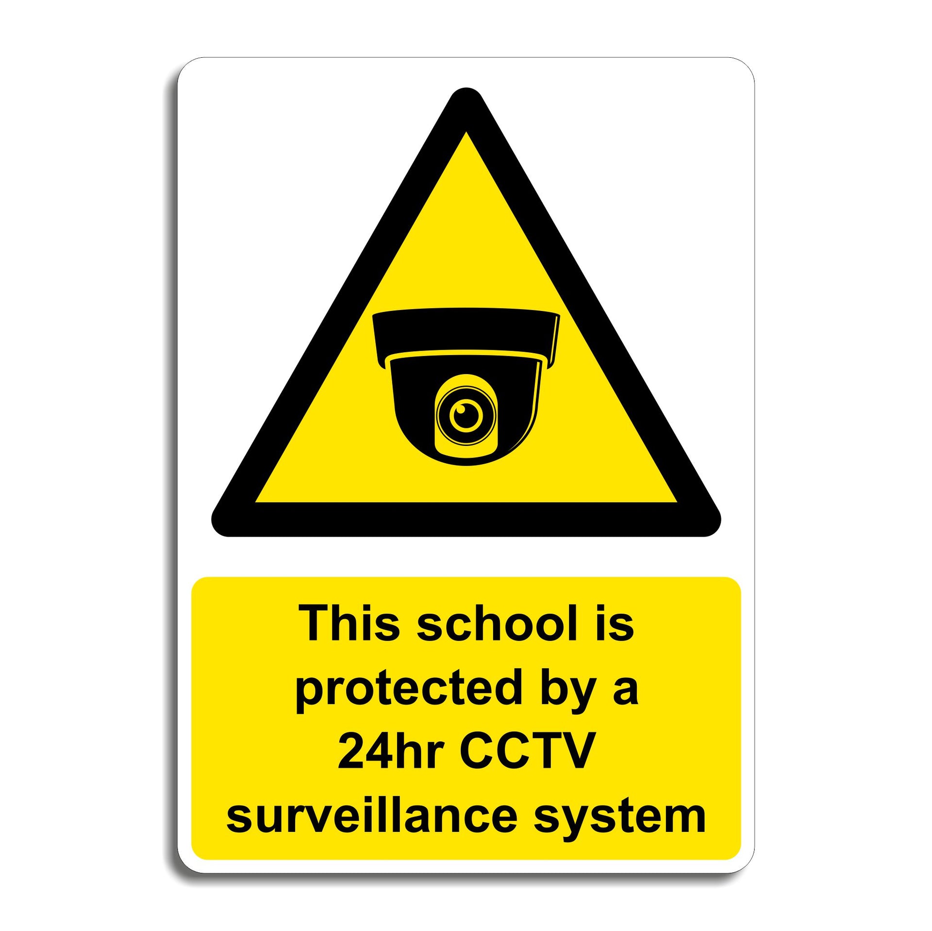 This School Is Protected By A 24hr CCTV Surveillance System Signs are used to inform students, staff, and visitors that surveillance cameras are actively monitoring the premises to enhance security and ensure a safe learning environment. These signs serve both as a deterrent against inappropriate or criminal behaviour, such as vandalism, theft, trespassing or bullying, and as a reassurance that the school is taking proactive measures to protect everyone on site. All our safety signs are compliant with BS EN ISO 7010 where applicable.
