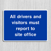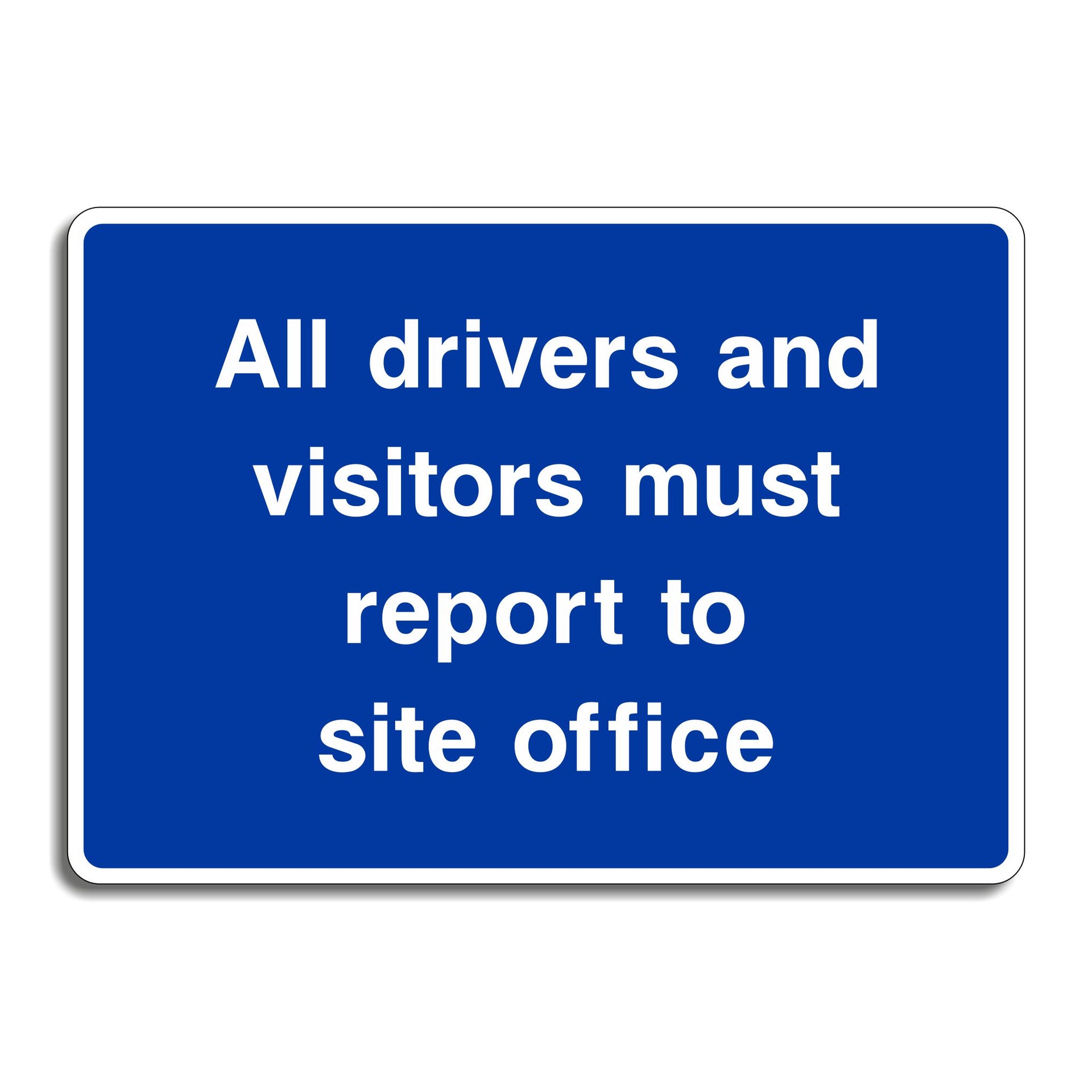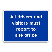 All Drivers and Visitors Must Report to Site Office Signs are used to clearly instruct anyone entering a site, especially drivers and visitors unfamiliar with the premises, that they are required to check in at the site office before proceeding further. They help control access to the site by ensuring all visitors and drivers are identified and accounted for upon arrival. All our safety signs are compliant with BS EN ISO 7010 where applicable.