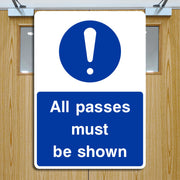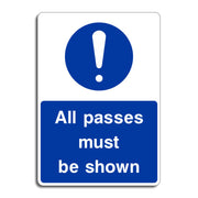 All Passes Must Be Shown Signs are access control notices used to inform individuals that they must present valid identification or authorization passes to enter a specific area. They ensure that only authorized personnel, visitors, or contractors are allowed entry, helping to maintain a secure environment. By requiring visible passes, the sign helps prevent unauthorized access, theft, or breaches in sensitive or restricted areas. All our safety signs are compliant with BS EN ISO 7010 where applicable.