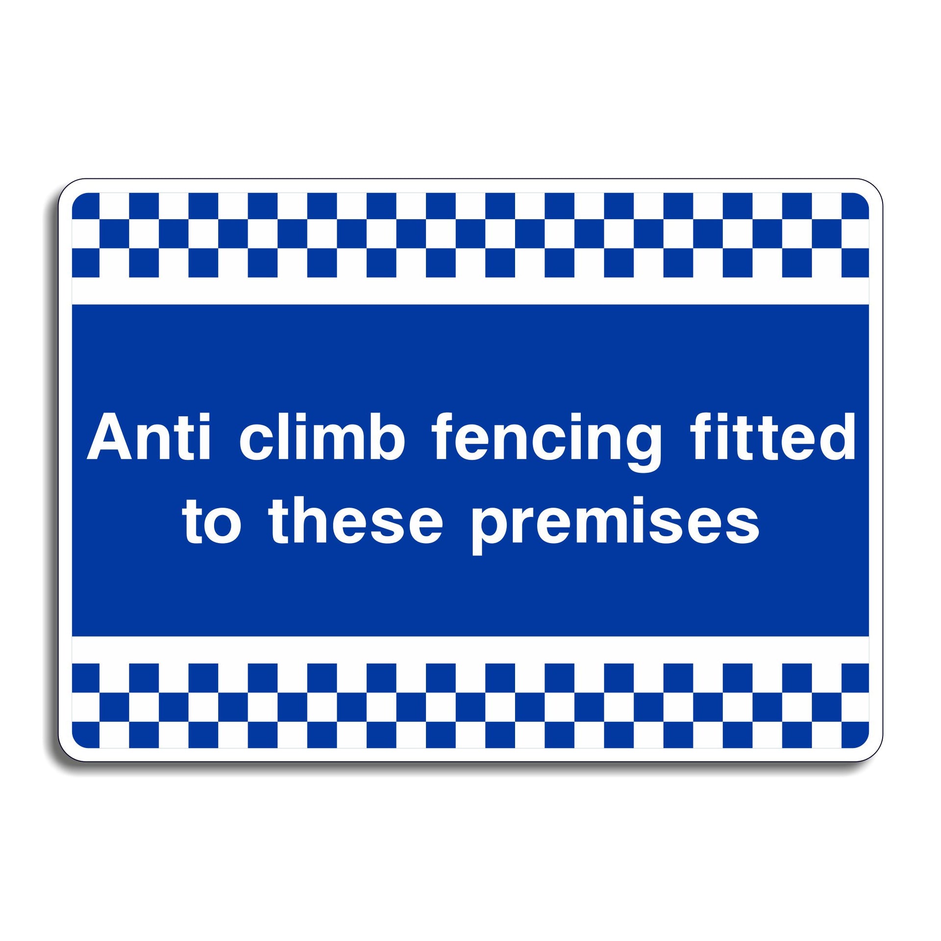 Anti Climb Fencing Fitted To These Premises Signs are displayed to warn and inform people that the property is protected by specialized fencing designed to prevent climbing. The sign warns potential trespassers or burglars that the fencing is difficult to climb, discouraging attempts to enter unlawfully. All our safety signs are compliant with BS EN ISO 7010 where applicable.
