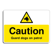 Caution Guard Dogs on Patrol Signs are warning notices used to alert people that trained security dogs are actively patrolling the area. The presence of guard dogs is a strong deterrent to intruders, trespassers, or criminals. The sign warns that entering the area could result in a confrontation with a trained security dog. All our safety signs are compliant with BS EN ISO 7010 where applicable.
