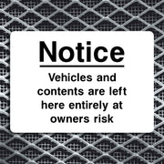 Notice Vehicles And Contents Are Left Here Entirely At Owners Risk Sign