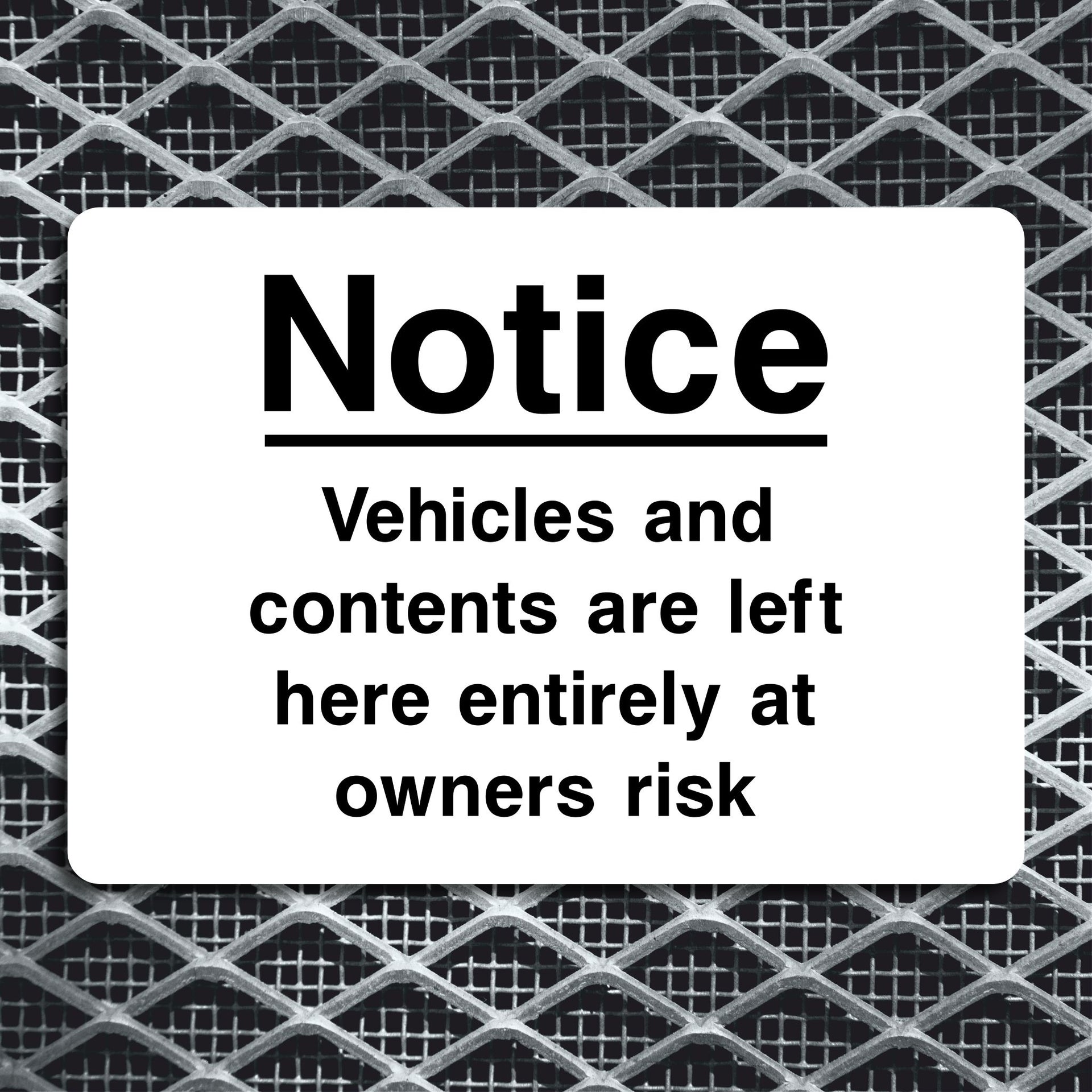 Notice Vehicles and Contents Are Left Here Entirely at Owner’s Risk Signs are displayed in parking lots, private properties, and similar areas to inform drivers that the property owner or operator does not accept responsibility for any loss or damage. The sign serves as a disclaimer, stating that the management is not responsible for theft, vandalism, or damage to vehicles or belongings left inside. All our safety signs are compliant with BS EN ISO 7010 where applicable.