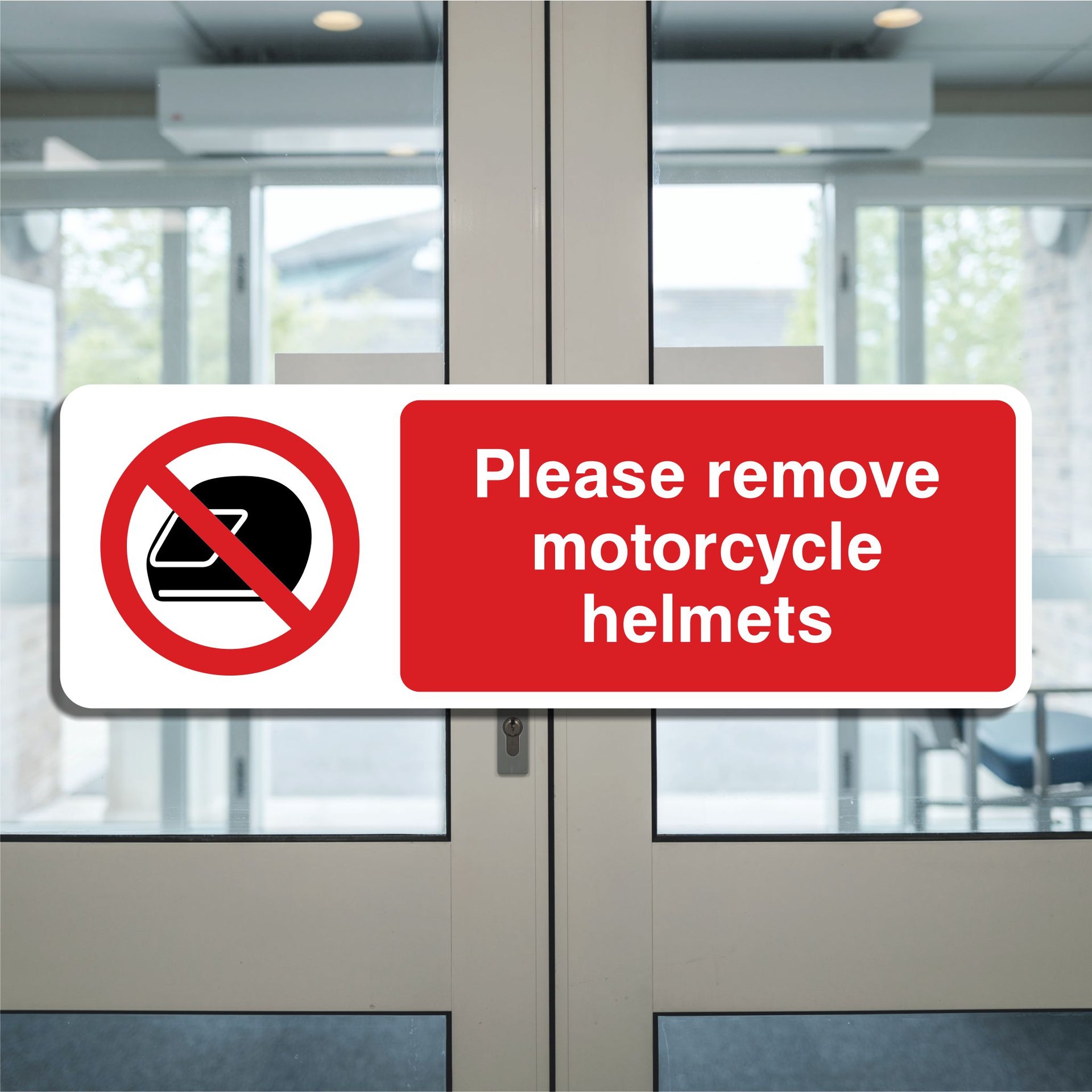 Please Remove Motorcycle Helmets Signs are used to politely request that individuals take off their helmets before entering a building or designated area. Removing helmets allows for clear identification of individuals, which is important in locations like banks, shops, and government buildings where surveillance or ID verification is required. Helmets can be used to conceal stolen items or hide a person’s identity, so asking for their removal helps deter criminal activity. All our safety signs are compliant with BS EN ISO 7010 where applicable.