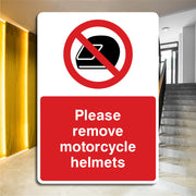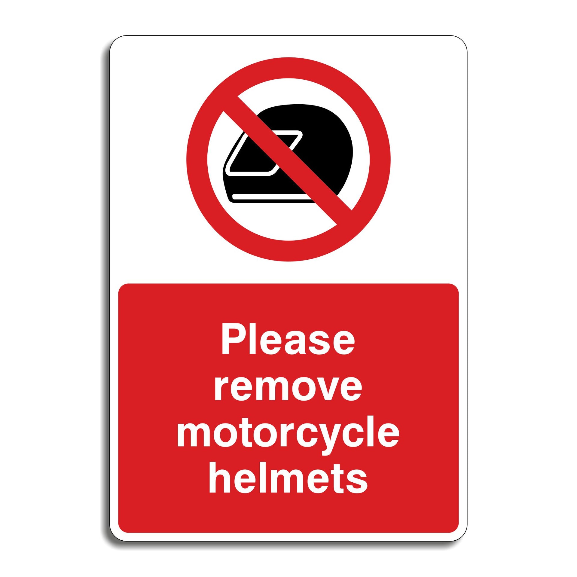 Please Remove Motorcycle Helmets Signs are used to politely request that individuals take off their helmets before entering a building or designated area. Removing helmets allows for clear identification of individuals, which is important in locations like banks, shops, and government buildings where surveillance or ID verification is required. Helmets can be used to conceal stolen items or hide a person’s identity, so asking for their removal helps deter criminal activity. All our safety signs are compliant with BS EN ISO 7010 where applicable.