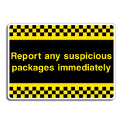 Report Any Suspicious Packages Immediately Signs are displayed in public places, workplaces, or transport hubs to encourage vigilance and prompt reporting of potentially dangerous or unusual items. They remind people to be alert to unusual or unattended packages that could pose a security threat, such as explosives or hazardous materials. Early reporting of suspicious packages helps security personnel or law enforcement assess and manage potential risks before they escalate. All our safety signs are compliant with BS EN ISO 7010 where applicable.