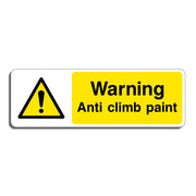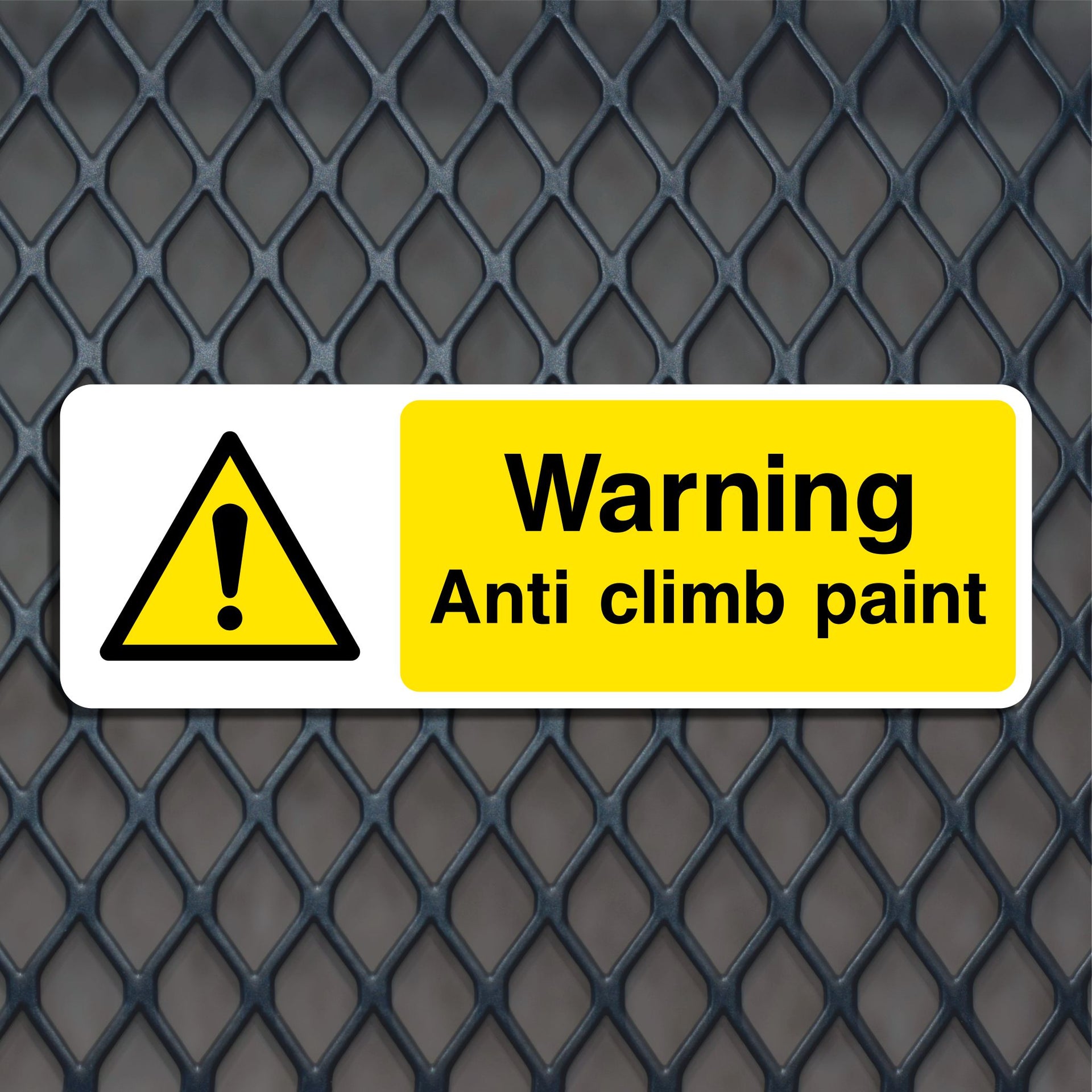 Warning Anti-Climb Paint Signs are hazard and security notices used to inform people that surfaces (such as walls, fences, or drainpipes) have been coated with anti-climb paint. Anti-climb paint remains slippery and does not dry fully, making it difficult for intruders to gain a foothold or grip. The sign warns potential trespassers of this obstacle, acting as a strong deterrent. All our safety signs are compliant with BS EN ISO 7010 where applicable.