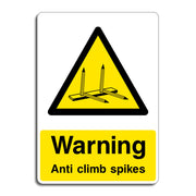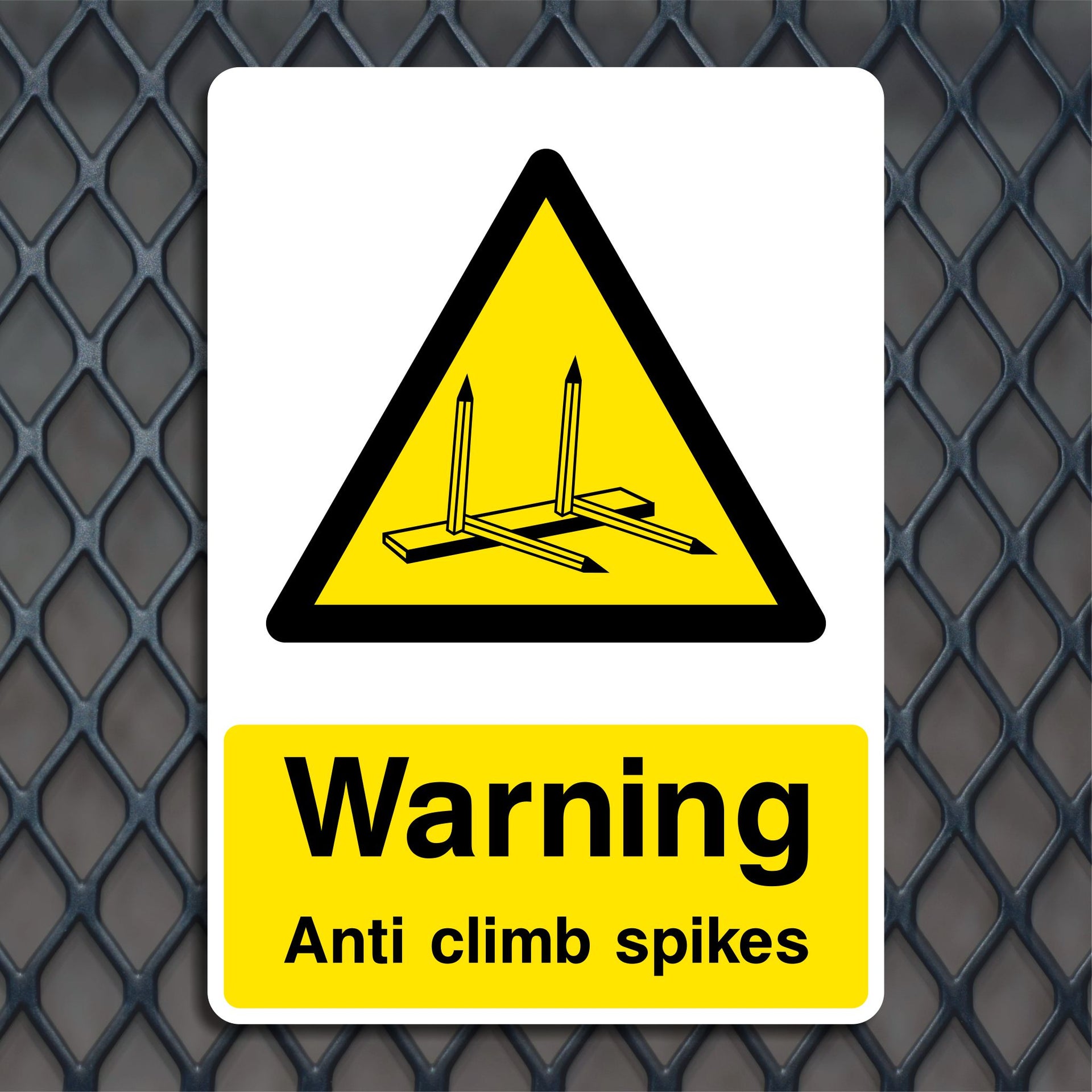 Warning Anti-Climb Spikes Signs are used to alert people that anti-climb devices, such as spikes or rotating barriers, have been installed on fences, walls, or other surfaces to deter unauthorized access or climbing. These signs are commonly found on perimeter walls, rooftops, gates, utility buildings, and secured facilities. All our safety signs are compliant with BS EN ISO 7010 where applicable.