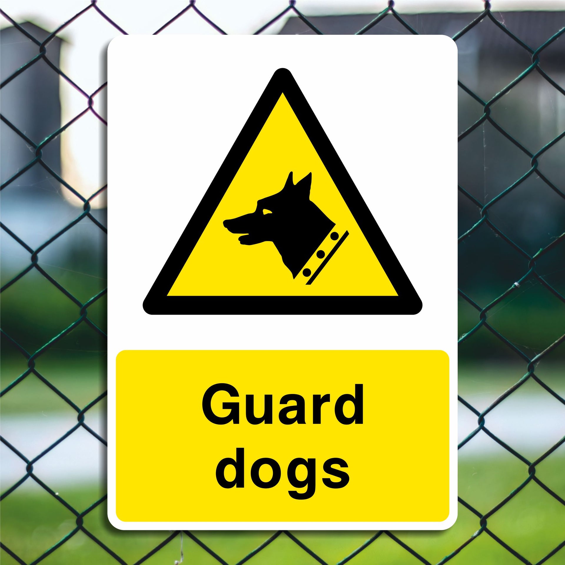 Guard dogs sign is to warn and inform people that trained dogs are being used to protect a property. The sign discourages intruders, burglars, or trespassers by warning them of a potential threat from guard dogs. It acts as a psychological barrier. many people won’t risk entering if they know dogs are present. All our safety signs are compliant with BS EN ISO 7010 where applicable.