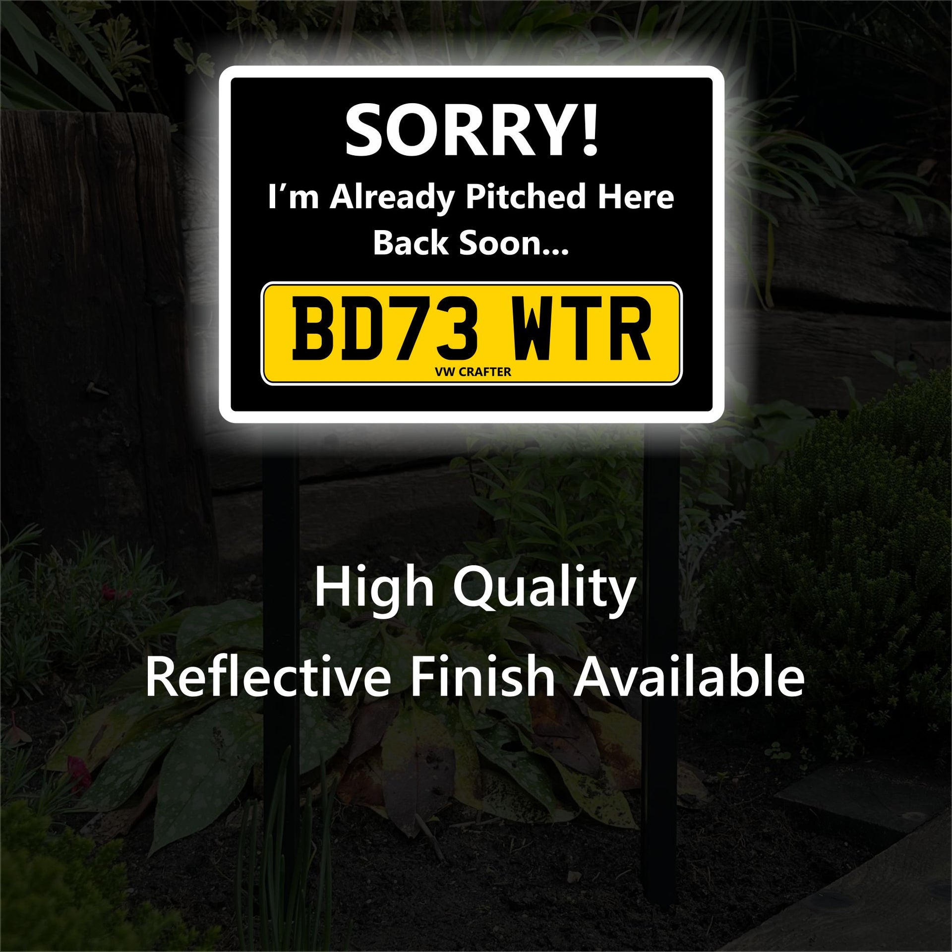 Our low level Personalised Campervan Pitch signs are available with a standard non-reflective white finish or a high quality white reflective background finish which is ideal for use at busy camping areas or in darker countryside or wooded areas where the signs will be more visible when light such as vehicle headlights or torches are shone onto the sign. Intended for low level use these signs are supplied with non-rusting powder coated aluminium stake/s that are supplied ready to be fitted to the rear of the sign panel making them quick and easy to install. We can print the make and vehicle registration number of your camper on these signs.