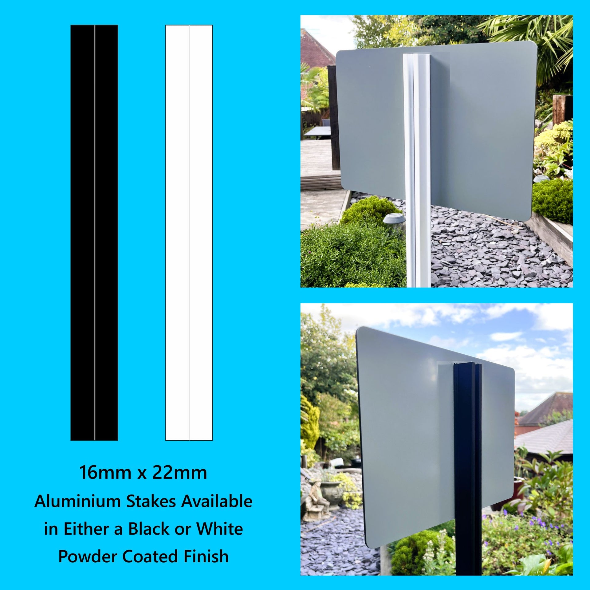 Aluminium Stake/s - Our low level stake signs are supplied with 16mm x 22mm aluminium stake/s. These aluminium stakes are available with either a black or a white powder coated finish.