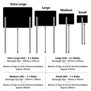 - Choose from Four Popular Sizes: Available in 4 sign panel sizes and 8 background colour options which are available with either black or white powder coated stake/s to suit your requirements.