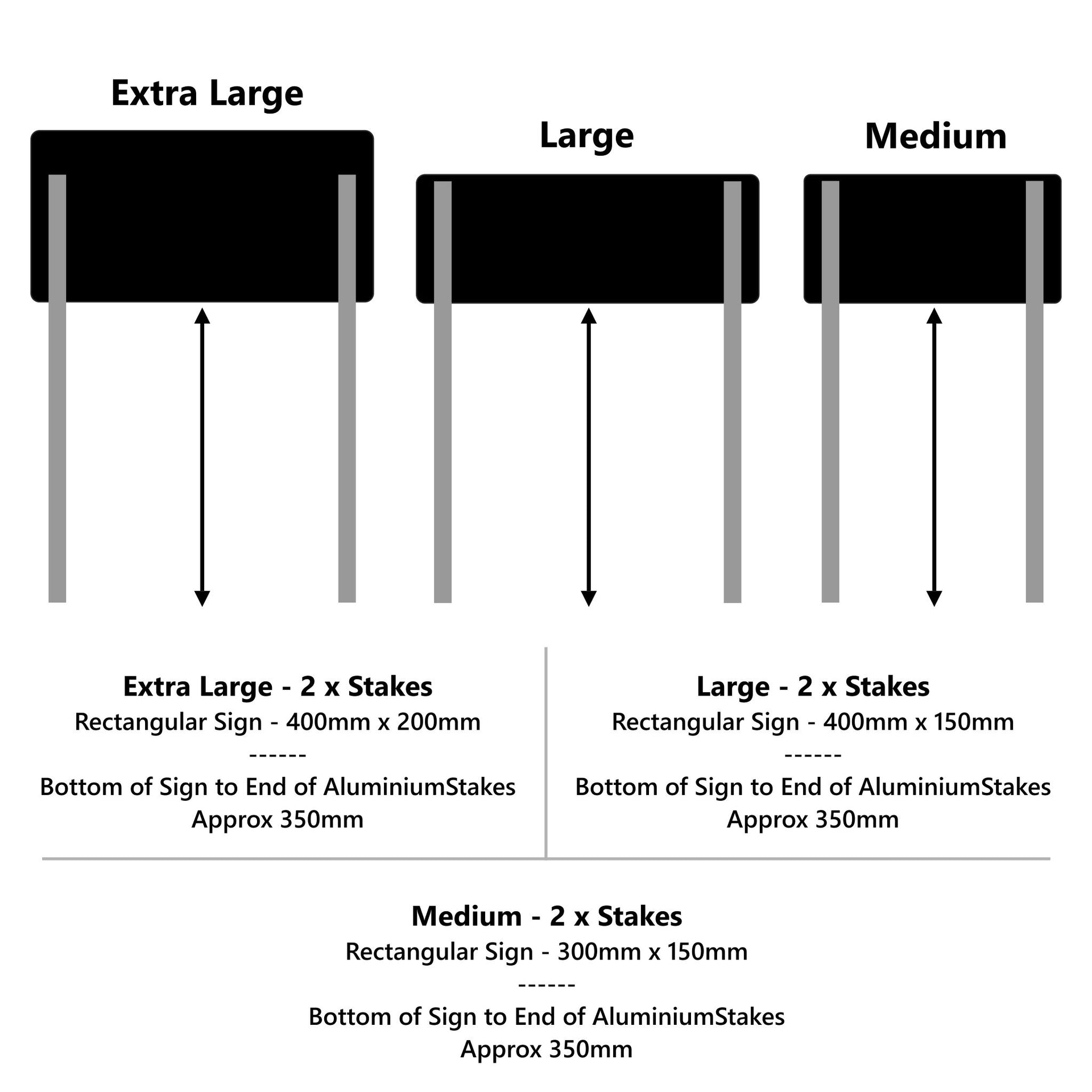 - Choose from Four Popular Sizes: Available in 3 sign sizes and 8 background colours which are all available with either black or white powder coated stake/s to suit your requirements.