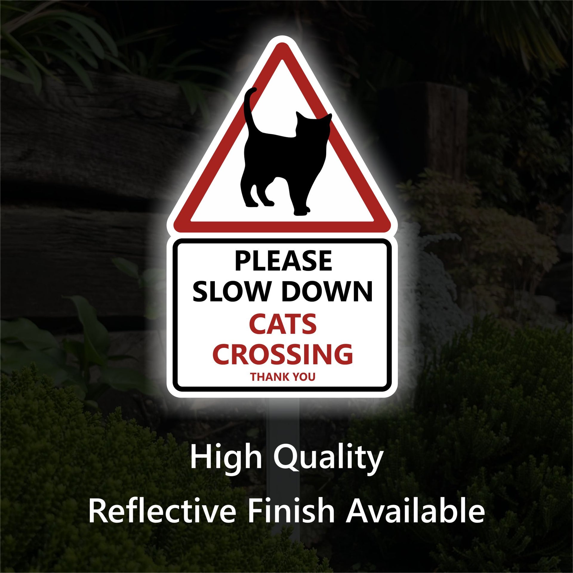 Our low level Please Slow Down Cats Crossing signs are available with a standard non-reflective white finish or a high quality white reflective background finish which is ideal for use on busy roads or in darker countryside or residential areas where the signs will be more visible when light such as vehicle headlights or torches are shone onto the sign. Intended for low level use these signs are supplied with non-rusting powder coated aluminium stake/s that are supplied ready to be fitted to the rear of the sign panel making them quick and easy to install.