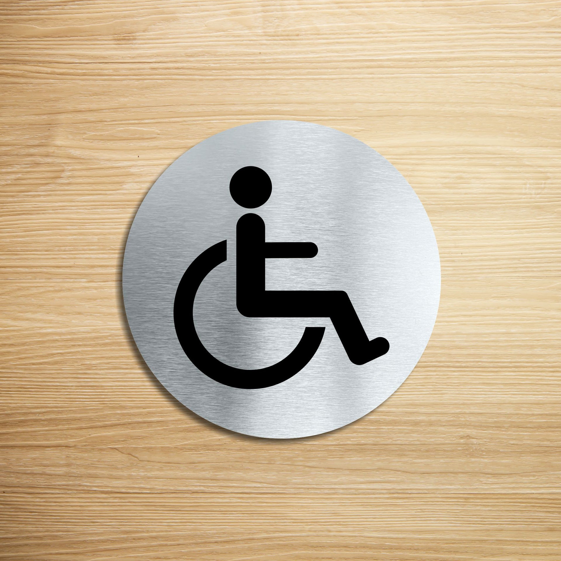 Enhance the look of your doors with our circular brushed aluminium Disabled Door Signs. Brushed silver aluminum door signs are known for their contemporary appeal, giving a high-end look that is both sleek as well as being practical. The distinctive brushed aluminium texture creates a modern aesthetic that is perfect for businesses or organisations aiming to convey a sense of style and professionalism. The textured metallic finish adds a touch of luxury, making brushed aluminum door signs a popular choice for any location. Manufactured by us here in the UK using a high quality 3mm brushed silver aluminium composite sheet each door sign is suitable for either internal or external use. Our door signs are precision cut to size and shape using one of our flat bed CNC routers and is then digitally printed directly to the surface using the very latest UV printing technology. This door sign is also available in a 3mm bright white aluminium composite finish. These door signs are supplied with self adhesive pads to allow for easy installation. We also offer a range of stylish screw fixings that are designed to compliment the finish of each sign. Due to the large selection of different sign designs to avoid drill holes in the actual image or text area we do not supply these signs with any pre-drilled holes.