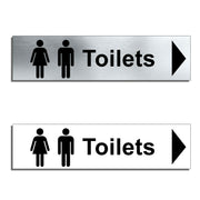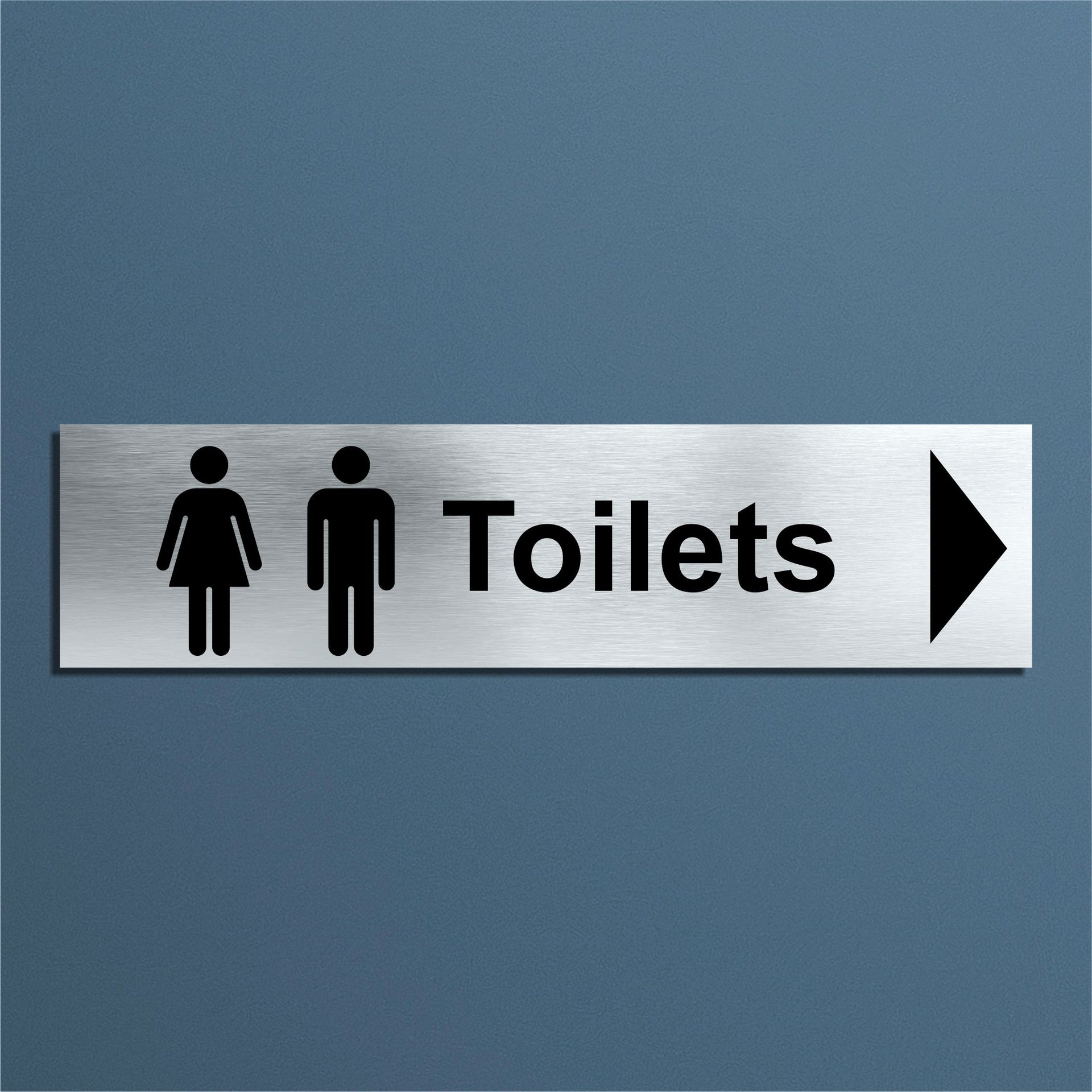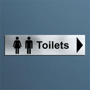 Enhance the look of your doors with our brushed aluminium Toilet Door Signs. This particular sign has a right pointing directional arrow to help guide users. Brushed silver aluminum door signs are known for their contemporary appeal, giving a high-end look that is both sleek as well as being practical. The distinctive brushed aluminium texture creates a modern aesthetic that is perfect for businesses or organisations aiming to convey a sense of style and professionalism. The textured metallic finish adds a touch of luxury, making brushed aluminum door signs a popular choice for any location. Manufactured by us here in the UK using a high quality 3mm brushed silver aluminium composite sheet each door sign is suitable for either internal or external use. Our door signs are precision cut to size and shape using one of our flat bed CNC routers and is then digitally printed directly to the surface using the very latest UV printing technology. This door sign is also available in a 3mm bright white aluminium composite finish. These door signs are supplied with self adhesive pads to allow for easy installation. We also offer a range of stylish screw fixings that are designed to compliment the finish of each sign. Due to the large selection of different sign designs to avoid drill holes in the actual image or text area we do not supply these signs with any pre-drilled holes.
