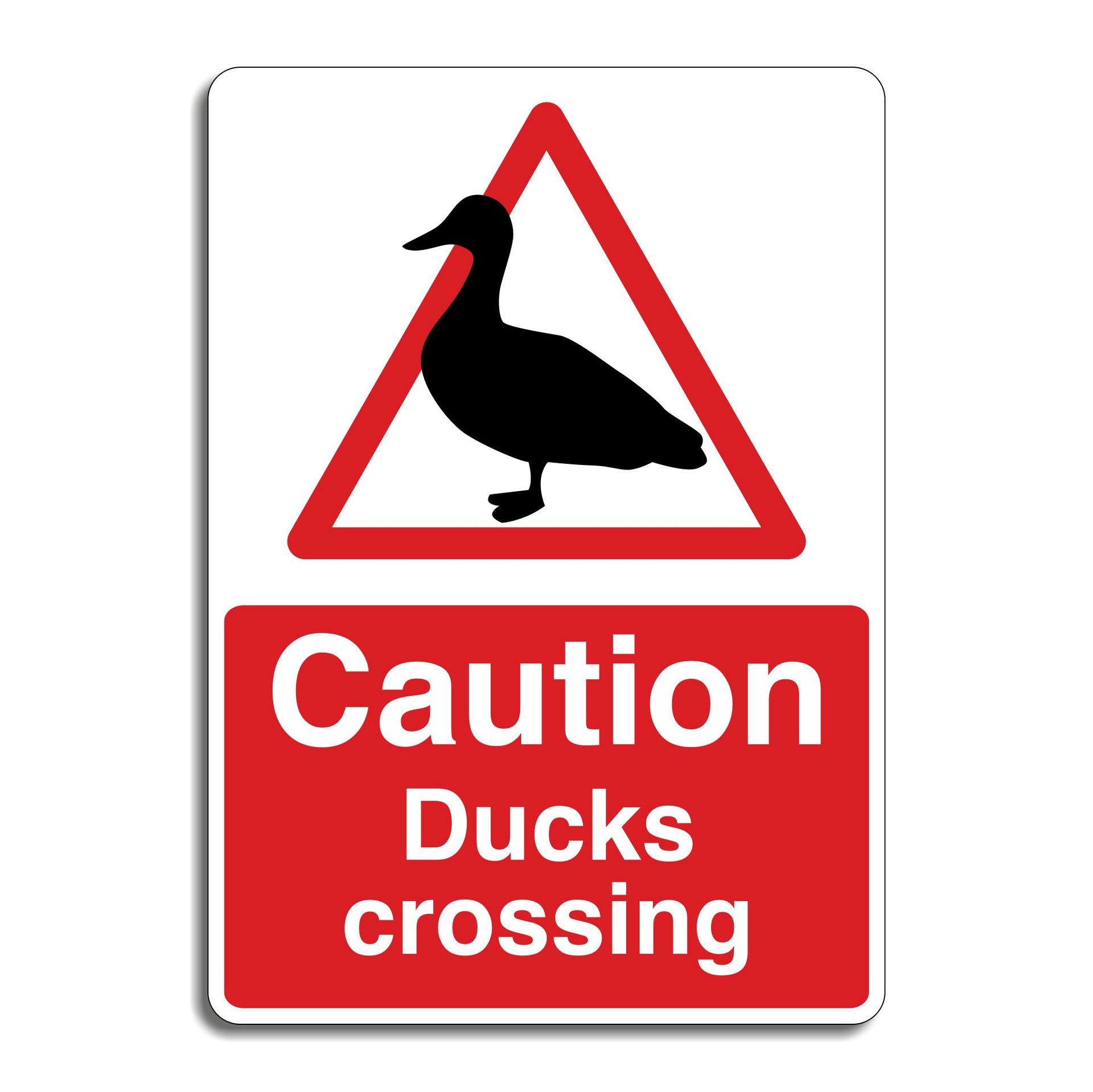 Caution Ducks Crossing Signs are used to warn drivers that ducks may be crossing the road in the area, prompting them to slow down and remain alert. These signs are typically installed near bodies of water, parks, or natural habitats where ducks frequently move between areas, often with ducklings in tow.