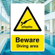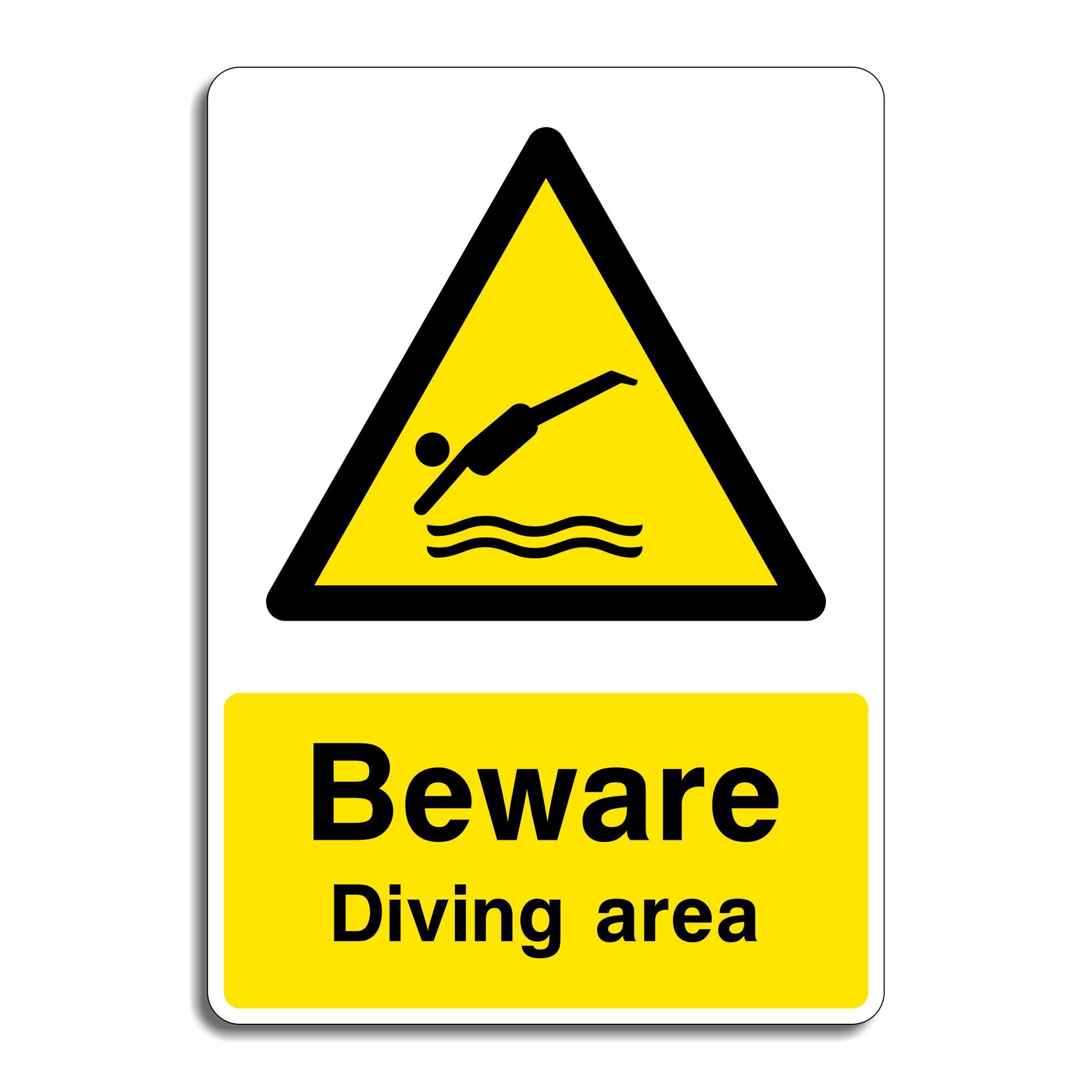 Beware Diving Area Signs are intended to alert individuals to the potential dangers associated with diving in a specific area, such as shallow water, submerged rocks, or strong underwater currents. Their primary purpose is to prevent accidents and injuries by warning swimmers, snorkellers, and divers of unsafe conditions that may not be immediately visible. All our safety signs are compliant with BS EN ISO 7010 where applicable.