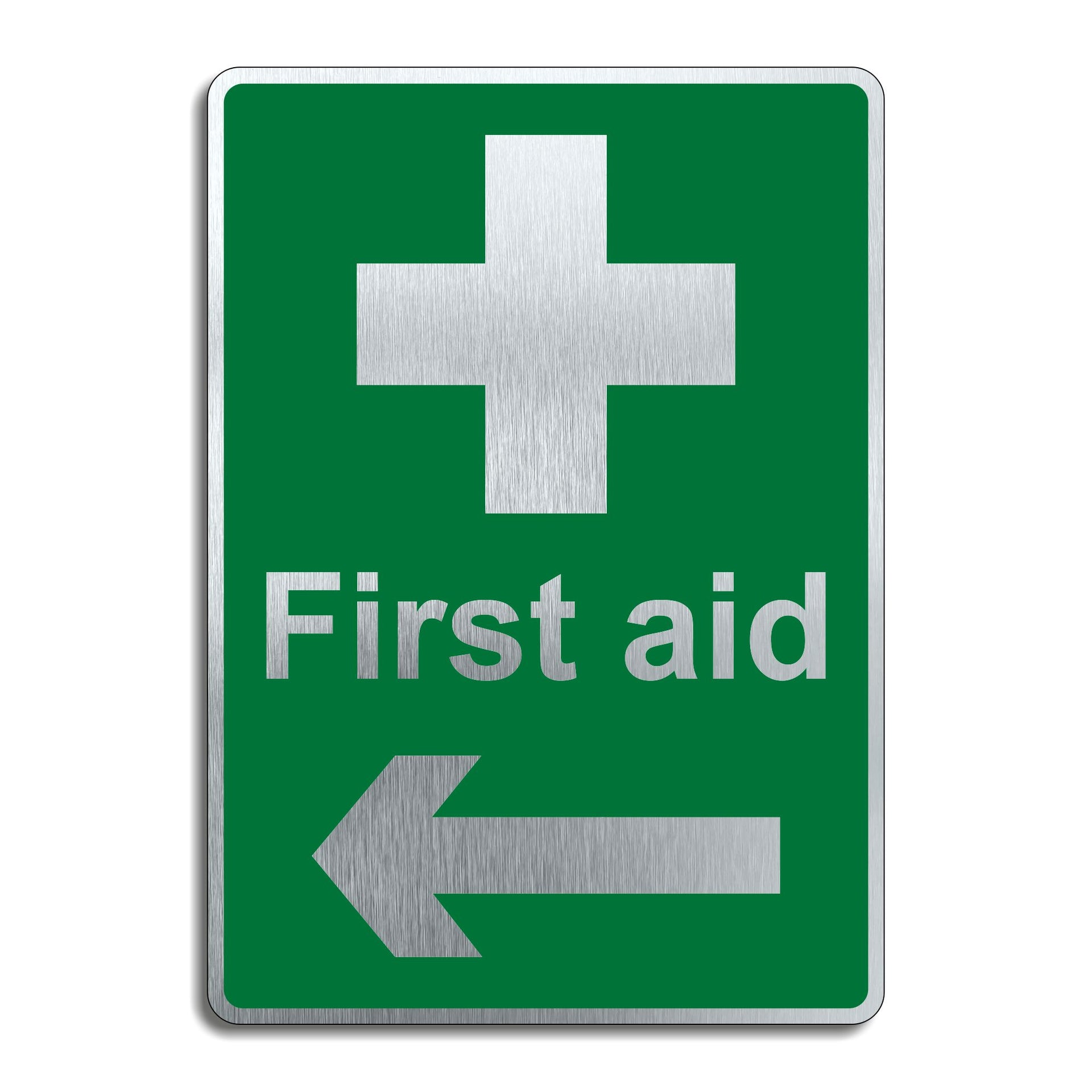 First Aid Sign with a Left Pointing Arrow in a Brushed Aluminium Finish