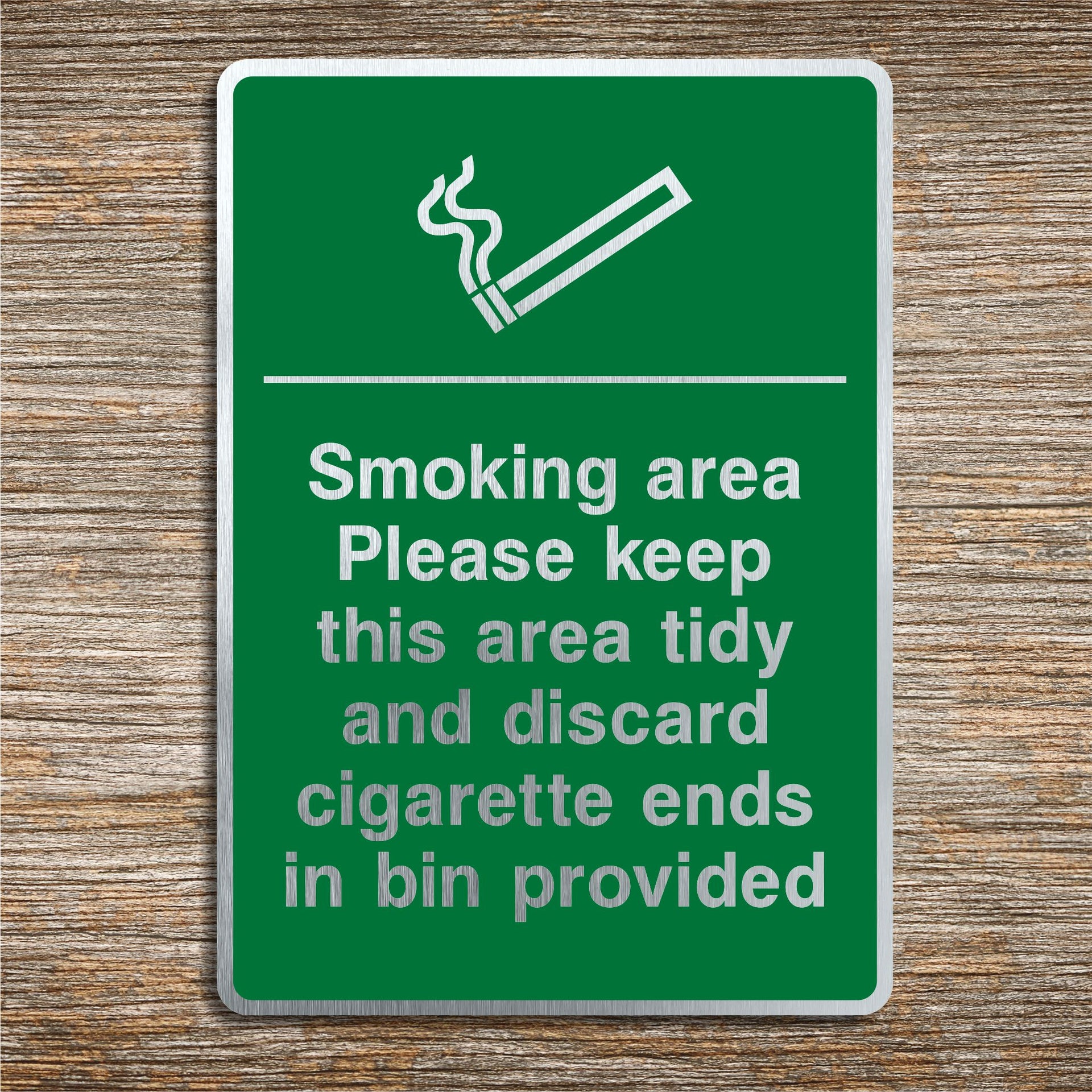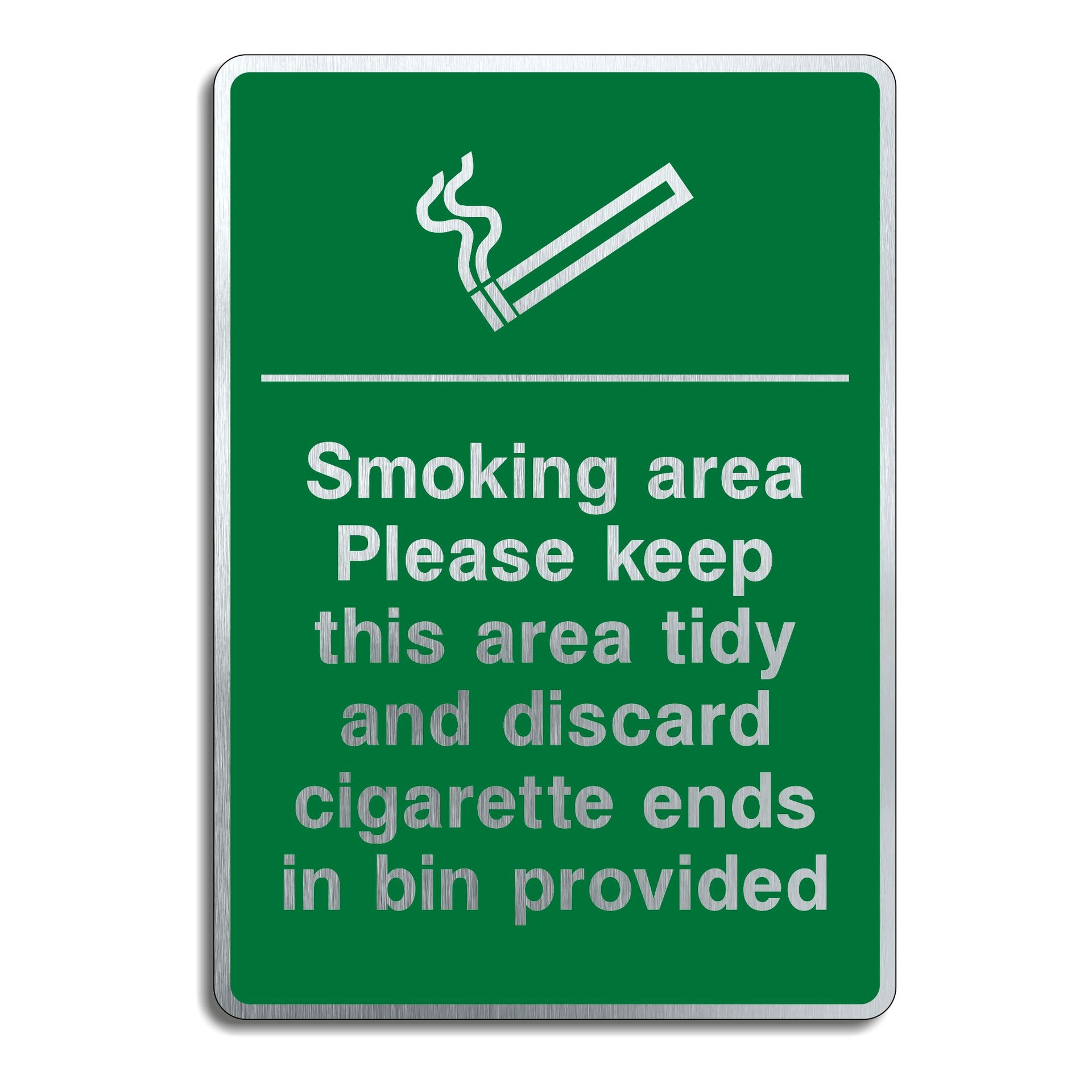 Brushed Aluminium Smoking Area Please Keep This Area Tidy and Discard Cigarette Ends in Bin Provided Sign